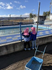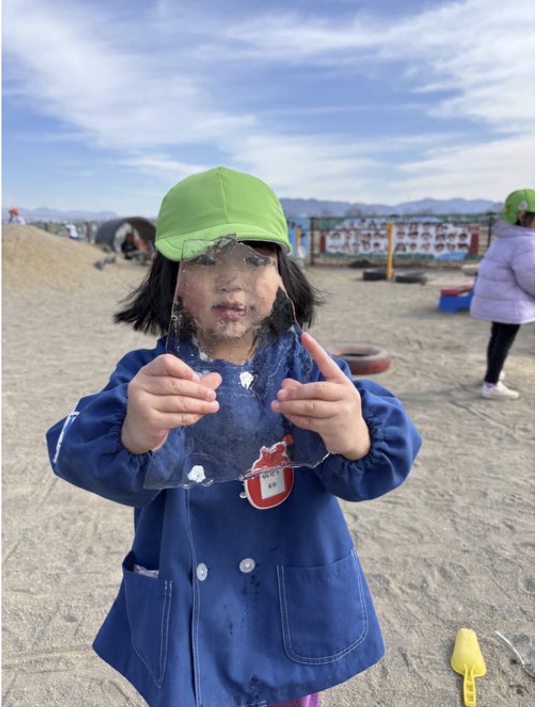 夏に楽しんでいた色水遊びを、冬の季節にも行いたいと考えていたところ子ども達がプールに氷が張っているのに気付き、そこから氷遊びが始まりました。最初は、氷を手に取れただけで満足!で中々遊びに繋がらない姿も見られましたが、年長さんが氷を作って楽しんでいる姿を見たり、ハッピータイムで色を混ぜて作れる氷コーナーを設けたところ0歳児〜5歳児と幅広く感触遊びが楽しめました。子どもの発想は斬新かつ、素敵だなと感じました。子どもの姿を見て、更に遊びが発展できるよう環境を整えていくことの大切さを感じました。