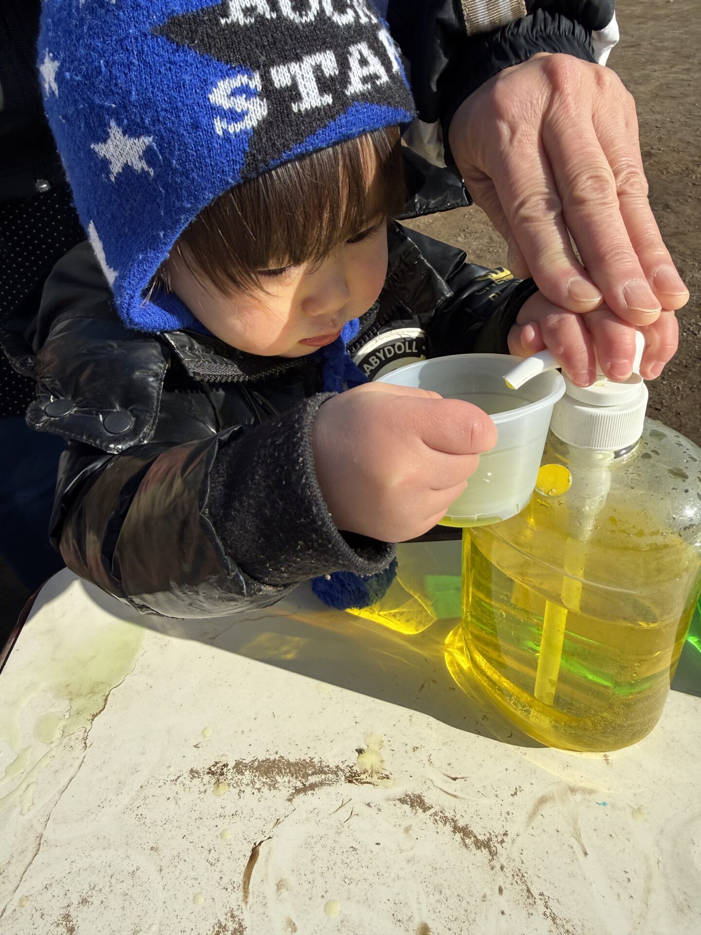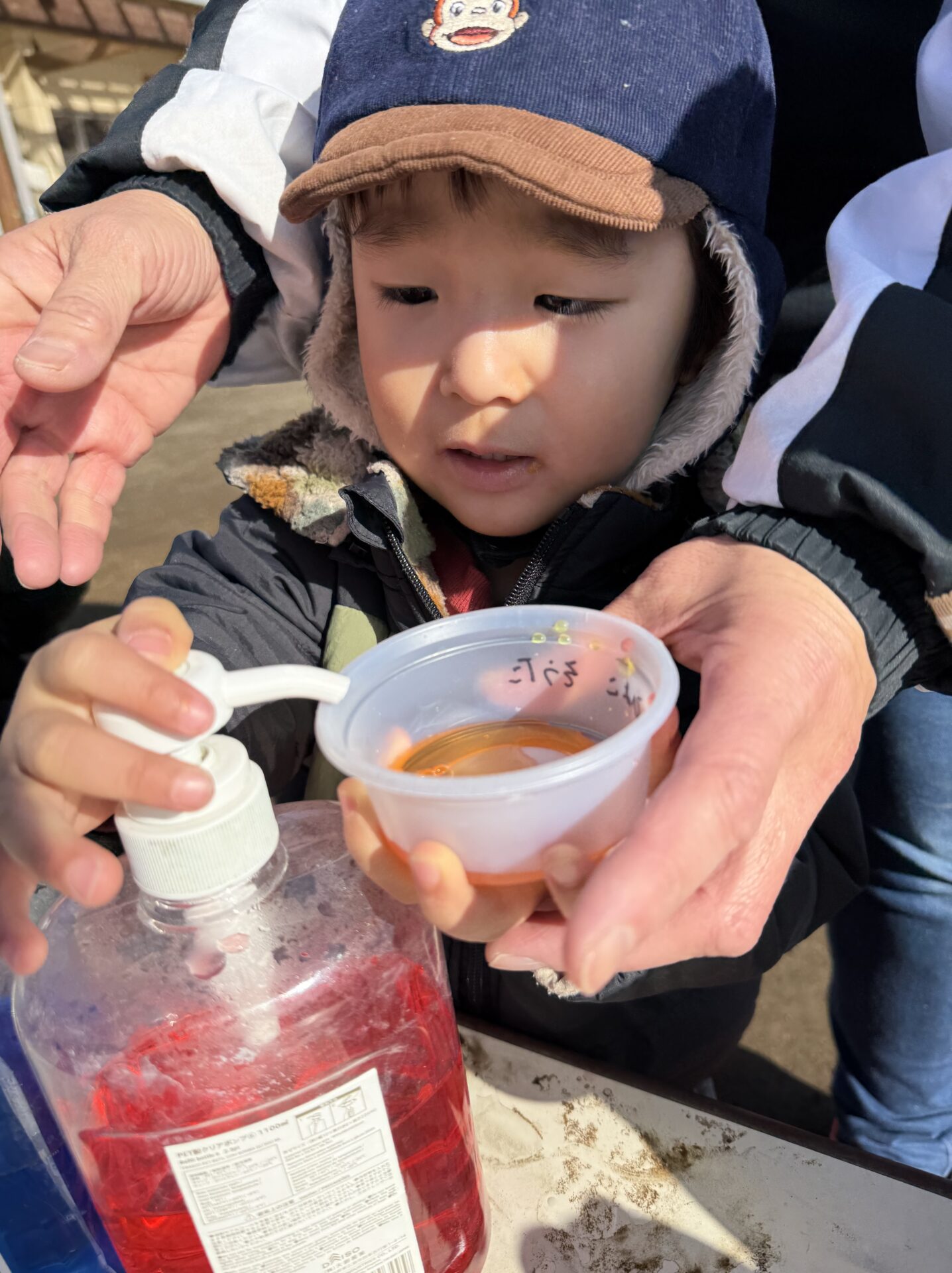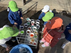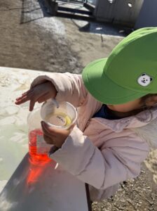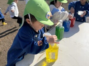 夏に草花を使って色水遊びを楽しんだ子ども達。冬は草花がないので、食紅を使って色水遊びを行いました。