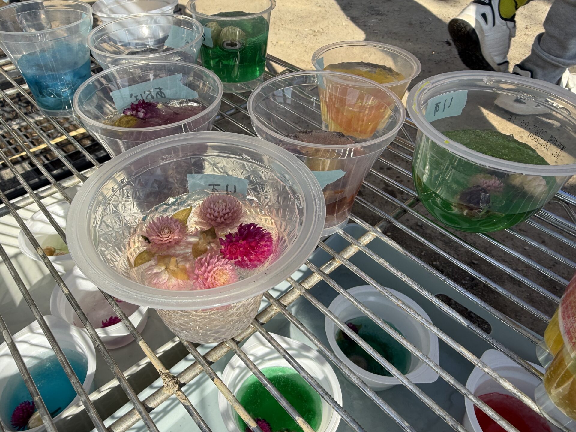 1歳児さんも、保育士に手伝ってもらいながら色を混ぜ合わせて氷作りを楽しんでいました。