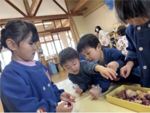 バケツ田んぼ作りを通して、イネの世話をしながら生長を見たり、田圃の生き物を発見したり調べたりしています。ほんのわずかな収穫ですが、秋には3歳、4歳児も一緒になって、稲こきやもみすり、精米まで協力して手作業で行う活動が定着し始めています。