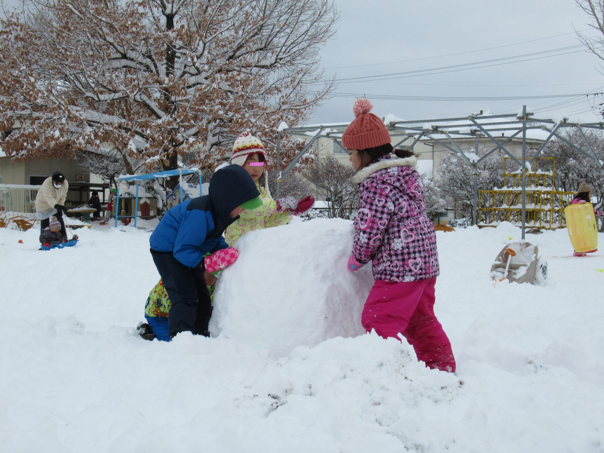 友達と力を合わせて大きな雪玉作りに挑戦中!