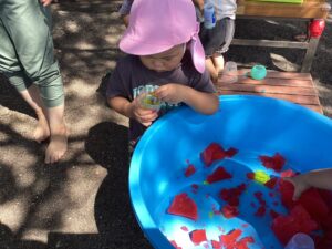グニグニ触ったりカップに移したり、感触を楽しみながら遊びが発展して行います。