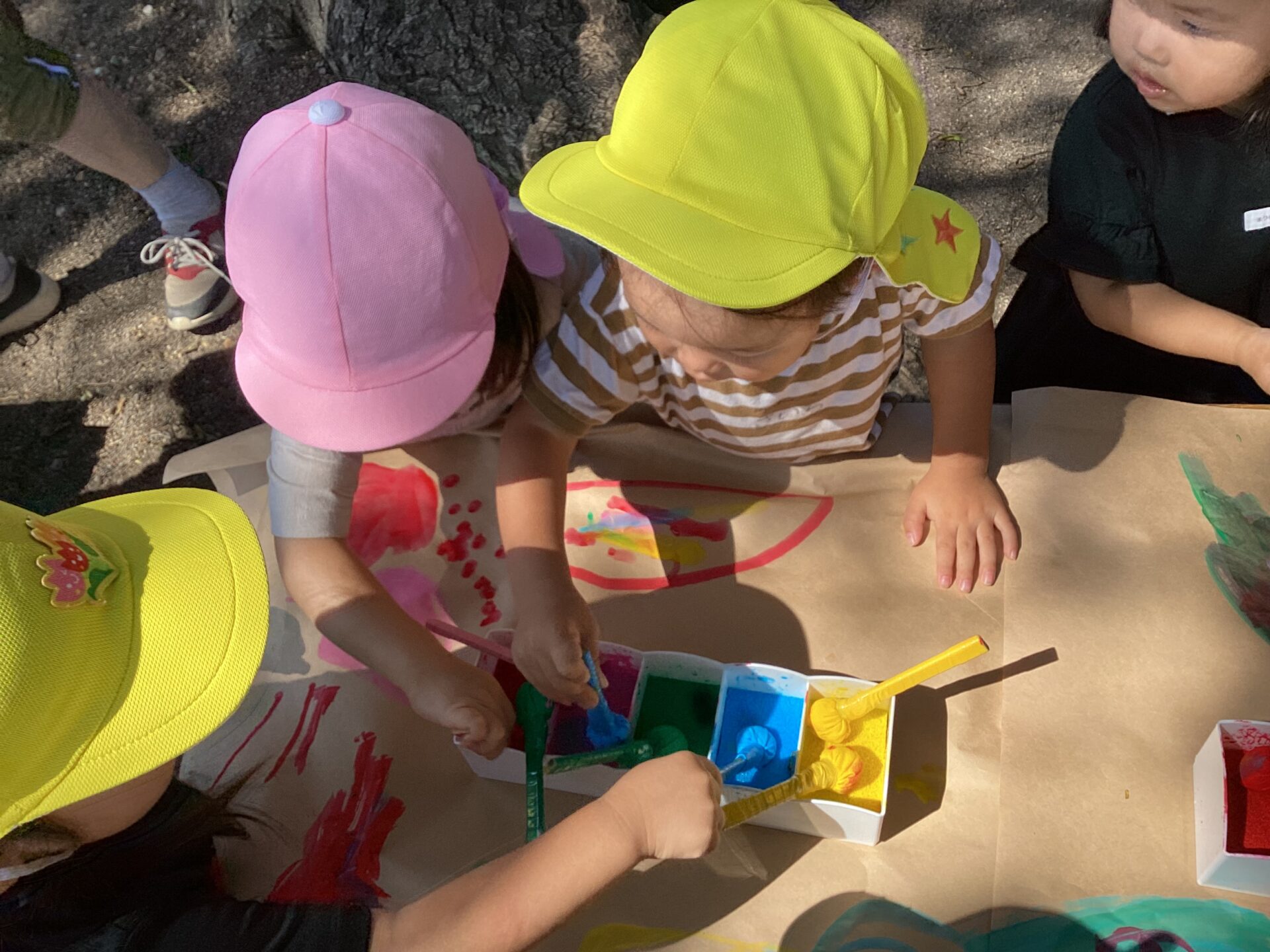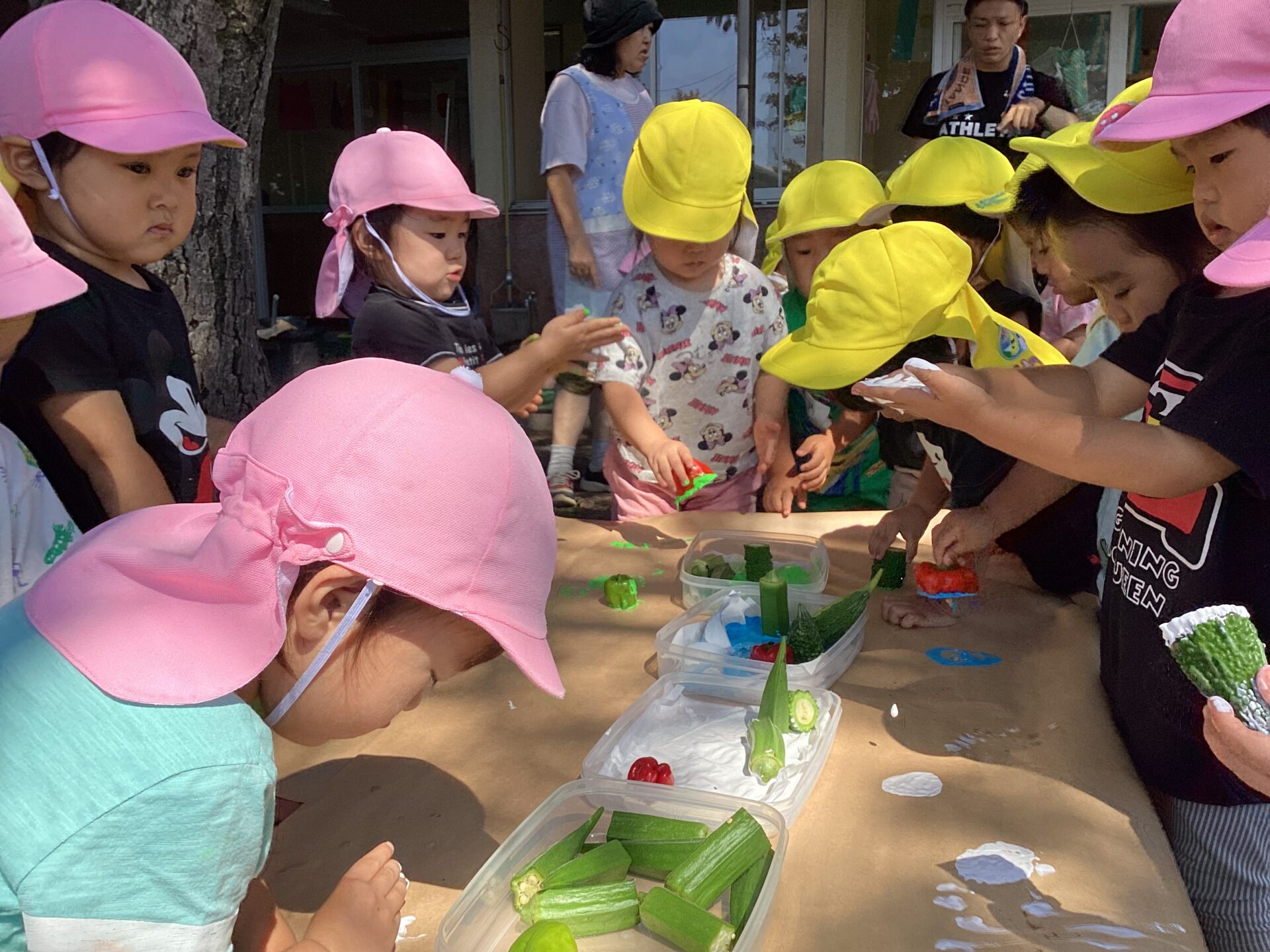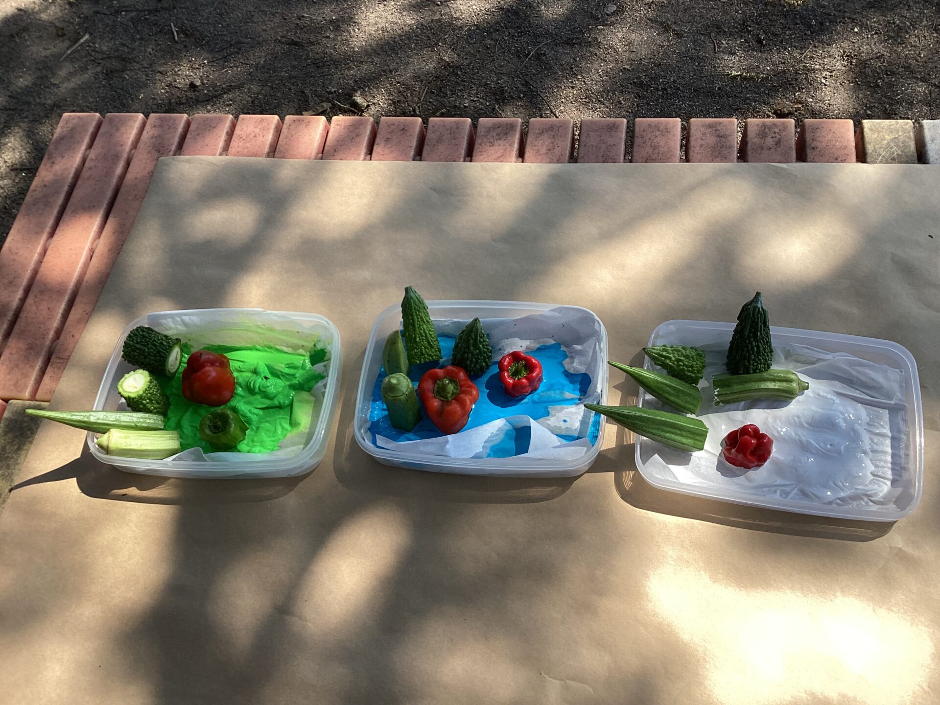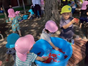 また、違う日には寒天遊びと野菜スタンプを園庭で楽しみました。