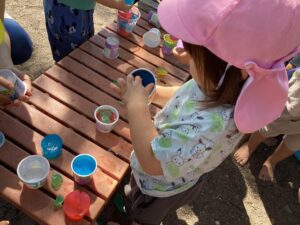 うまくカップから取り出せないといろんな指を使って取り出そうと頑張る子も。遊びの中で試行錯誤をして、自分のやりたいことをしようと頑張っていました。