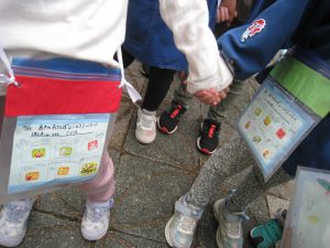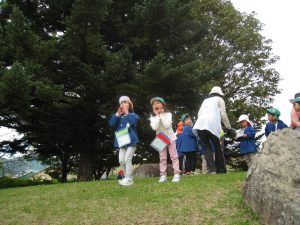 小さい子ども達が大きいクラスの子ども達の様々な活動における逞しい姿を見て、自分達も年長になったらという憧れの眼差しで見ている。裸足になって泥んこ遊びや水遊びを楽しみ、年長からプレゼントされたお散歩バッグを持って散歩に出掛け、土手滑り,草花遊び,木の実や虫を集めて自然と接する機会を作っている。