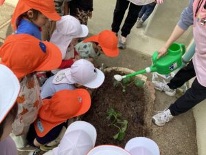 保育者が畑のきゅうりの苗を植え、水やりをしている様子を不思議そうにじっと見つめている子どもたち。「これはなに?」「どうやっておおきくなるの?」と、興味や期待を膨らませていました。