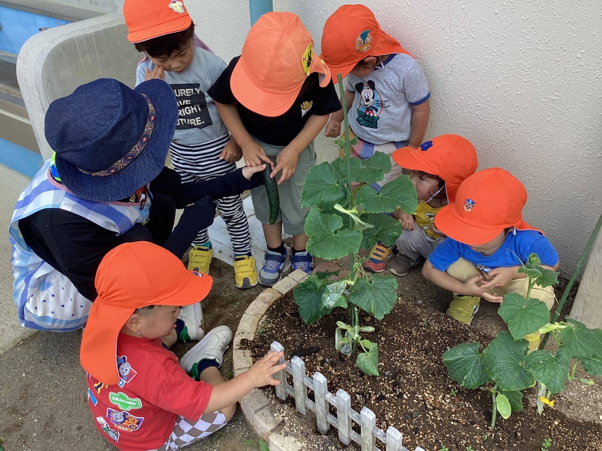 きゅうりが大きく育ちました!「おおきくなってる!」と目を輝かせながら収穫する子ども達の姿には、喜びと達成感が溢れていました♪