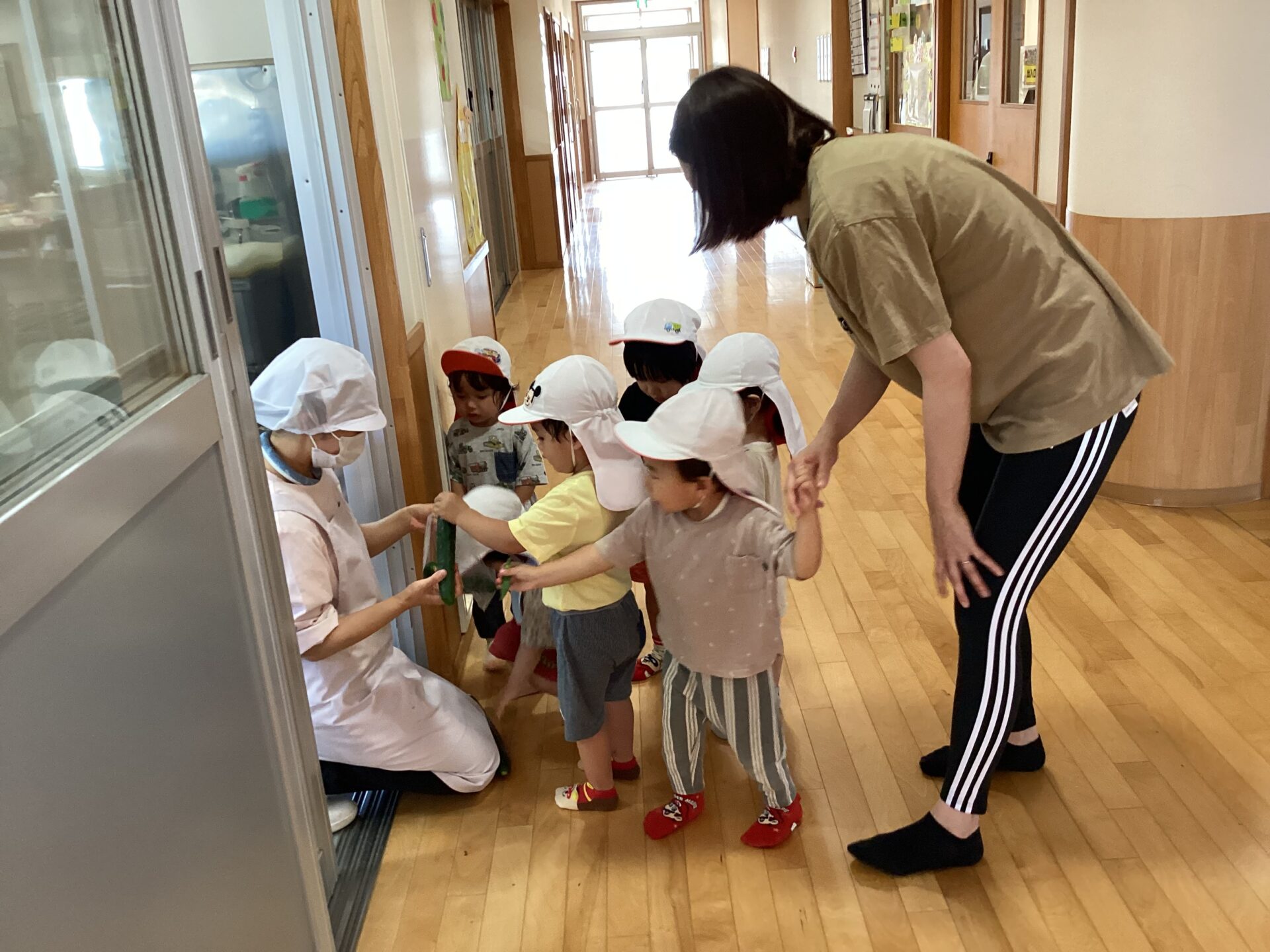 自分たちで育てた野菜を大切に抱えて、給食の先生に届けに行きました!「おねがいします」と手渡すと、先生が「ありがとう」と受け取ってくれて、子どもたちもにっこり^^