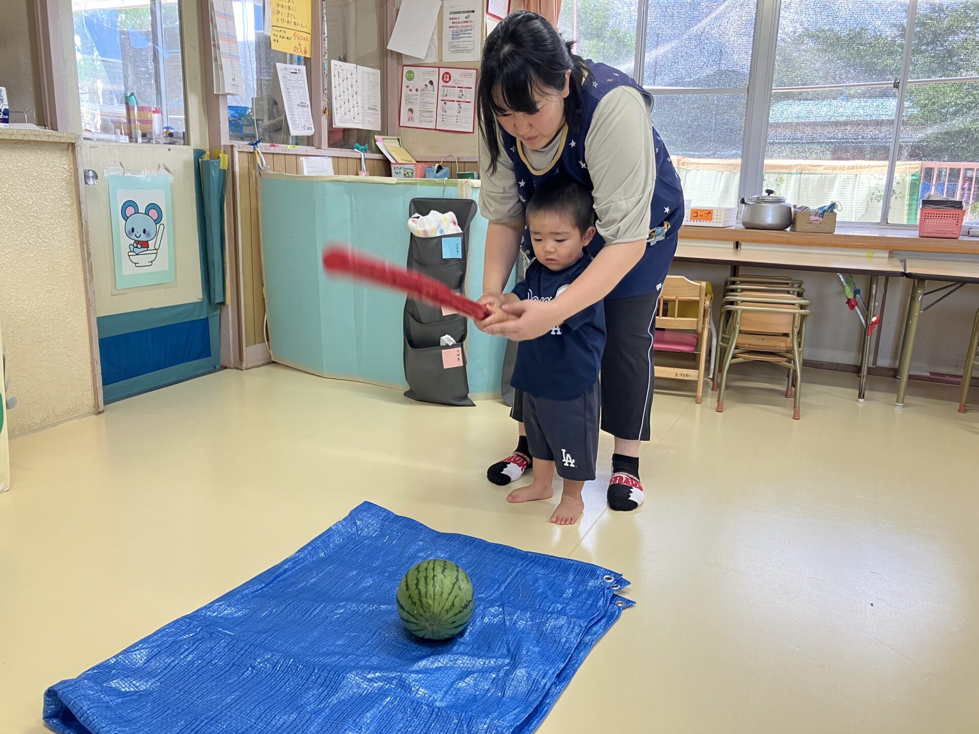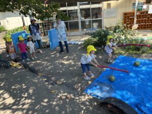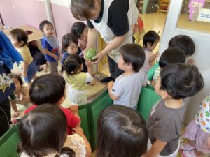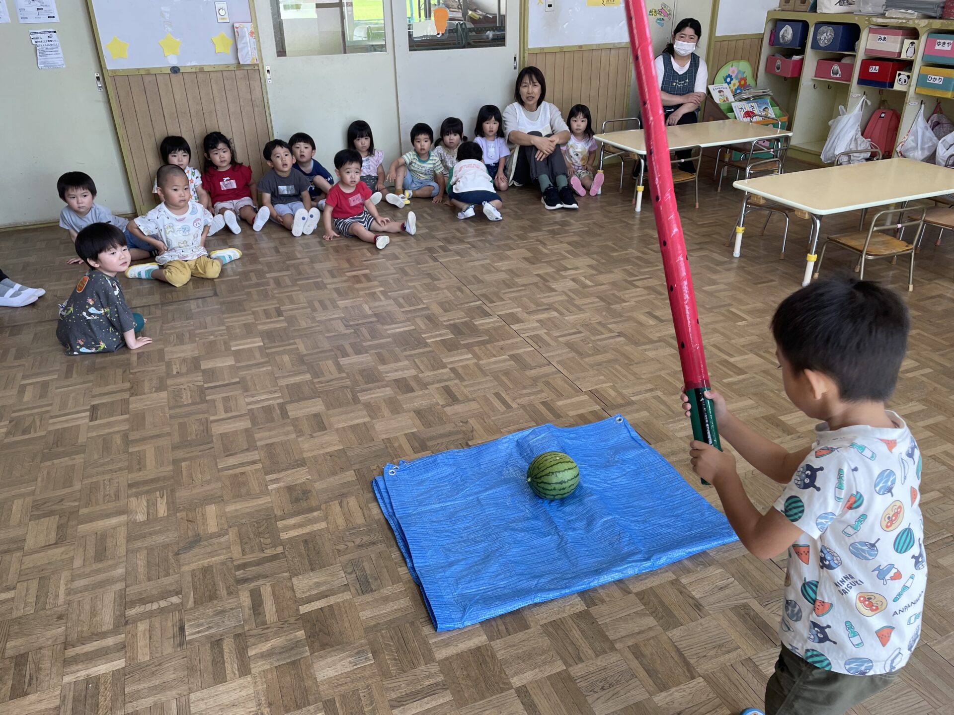 3歳未満児クラスでも、スイカ割りを楽しみました♪