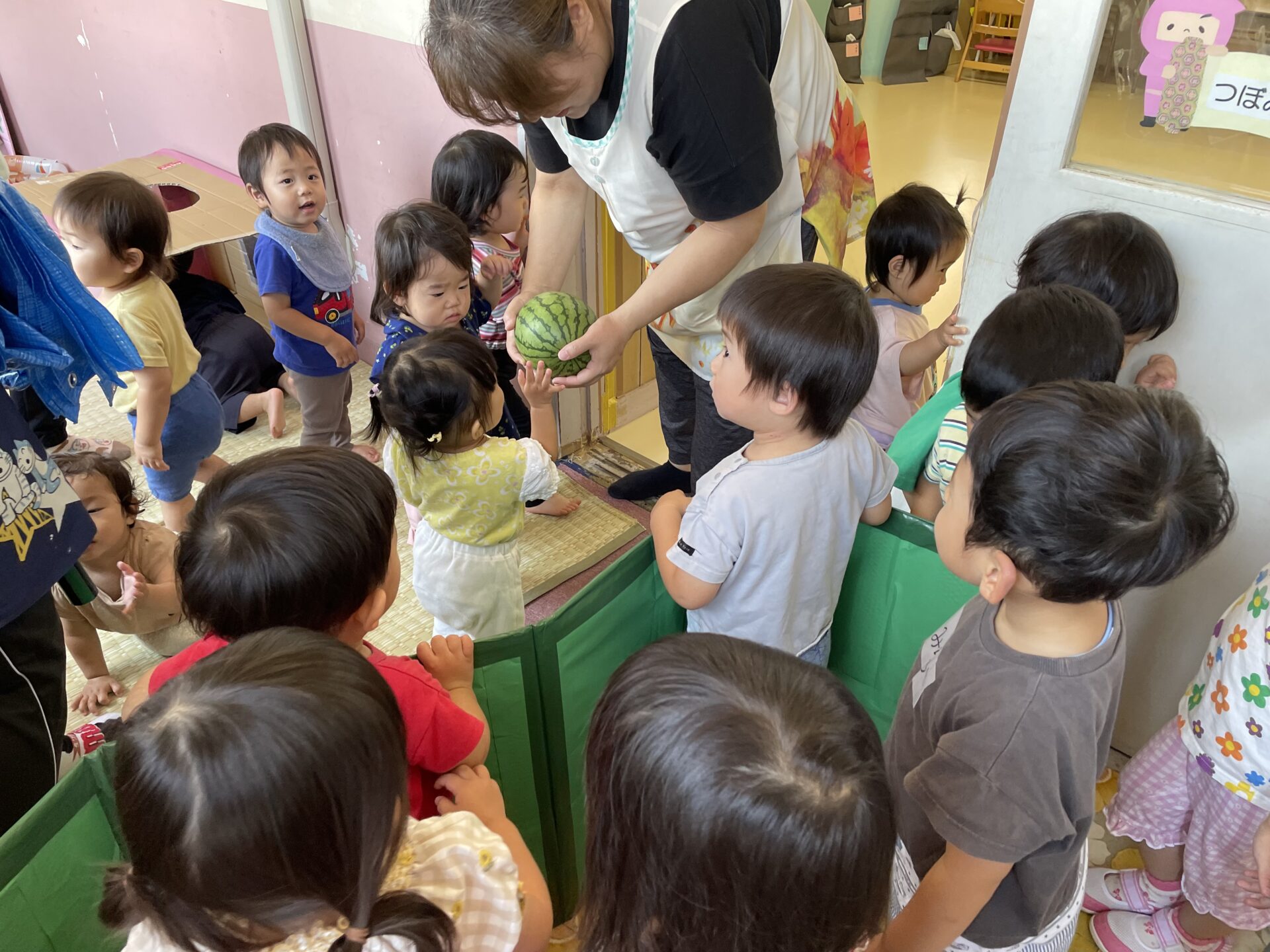 「保育園で獲れたスイカだよ〜」