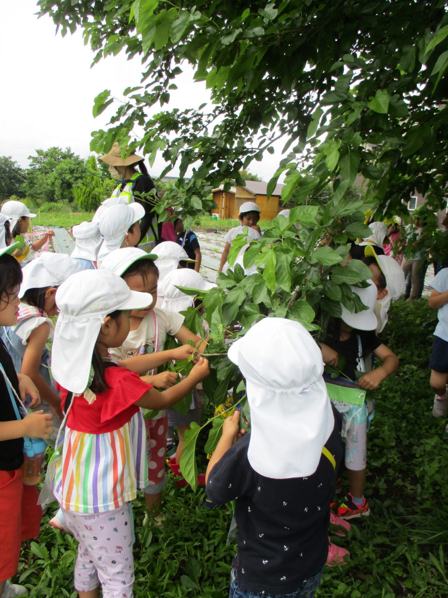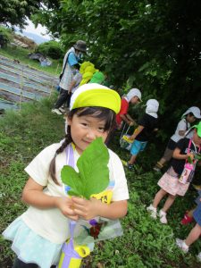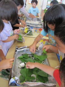 ・クラス前の菜園や畑できゅうり・ミニトマト・さつまいもなどの野菜作りをしている。収穫した野菜は給食で調理してもらい、皆で食べることで食育に繋げている。