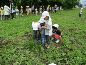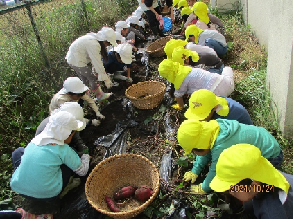 待ちに待ったさつまいも掘り。子どもたちの気合も十分。「出てくるかなあ?」