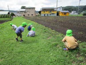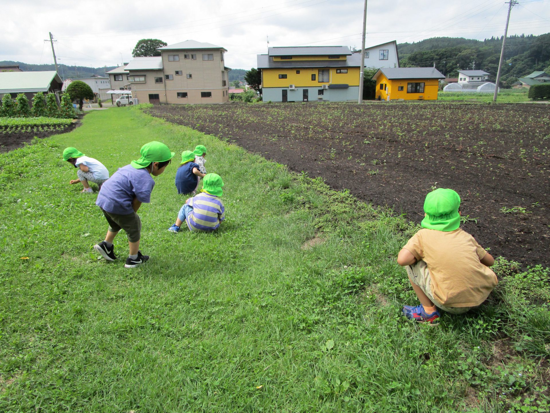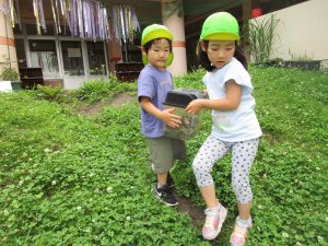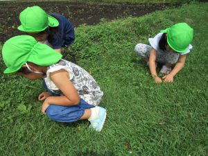 日々の日課になっているカゲチョロの餌探し。子ども達から「カゲチョロの餌とりに行こうよ」と声が上がります。バッタを捕まえることが出来ない子に「静かに近づくといいよ」「座ってみるとバッタが見つけられるよ」と自然に子ども同士で伝え合い、そして捕まえられるようになると、「やったね」「すごいじゃん」と誉め、共に喜び合う姿が見られました。