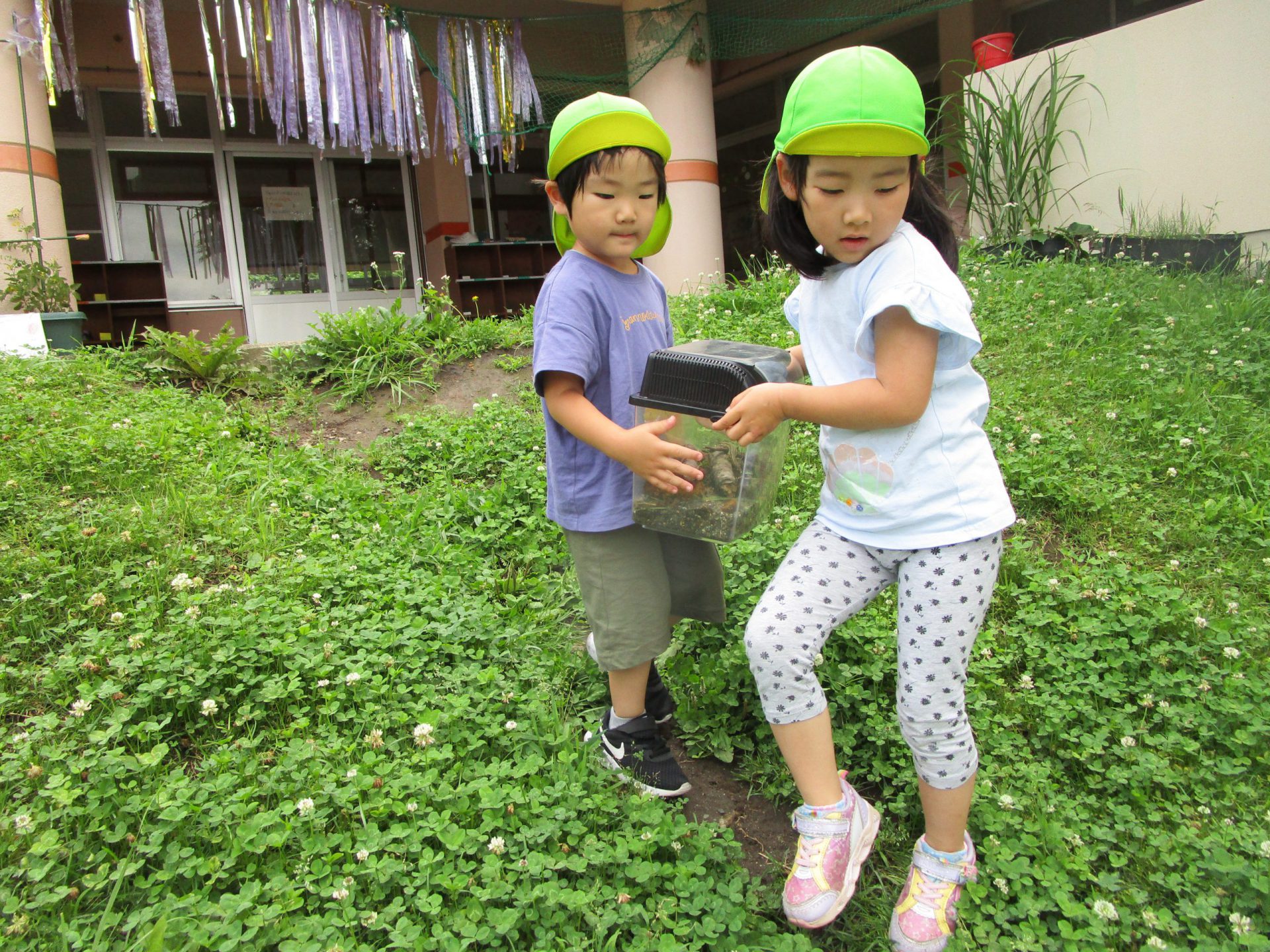 生命の大切さは言葉で伝えるのはとても難しいですが、飼育する中で子ども達は様々なことを学んでいるようです。今後も子どもの「これ何だろう?」に共感し、一緒に図鑑で調べたり、「やってみたい!」という声に温かく見守り挑戦できるよう援助したり、環境を整えてあげられるようにしていきたいです。
