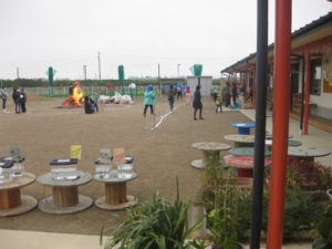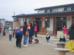 保育園周辺が田園に囲まれており園庭に出ると、北アルプスから菅平まで一望できる環境である。自然に恵まれており、日々自然に十分触れ合いながら保育を進めている。春は、自然の変化を感じながら多方面に散歩に出かけ、花の咲いていく様子を見たり、土手でのびろを掘ったりした。近くの畑のほうからは、玉ねぎ・あんず・ワッサーを頂き給食で食べたり、家に持ち帰った。四季を通して自然に恵まれ草花・オタマジャクシ・カエル・ザリガニ・カニ・バッタなどの小動物と触れあったり、捕まえて飼育している。散歩は、年齢や時間に合わせてコースを選び、すぐ近くの神社は大きな木があり暑い時期はとても過ごしやすい。散歩の途中では、農作物や水田を見ることができ食育にもつながっている。冬は、園庭の築山を生かし、ソリあそびができる。園の畑では、キュウリ・トマト・ナス・ピーマン・カブ・すいか・ジャガイモ・ポップコーン・赤じそ等栽培し、とれた食材は昼食で調理していただいている。地域の方とは、桃・りんご畑に招待していただき収穫体験をさせていただく。小学校からは40分ほど歩くが、年長児が一緒にサツマイモを植えたり掘ったりと交流をしている。