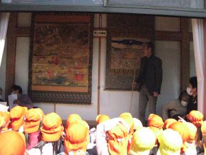 園庭には大きなくぬぎや樫の木があり、夏には大きな木陰で涼み、秋にはどんぐりで遊ぶことができる。住宅街の中ではあるが、近くに田園や小学校、神社、鎌田山などがあり、4,5歳児は鎌田山、坂田山に出かけるなど、年齢や季節に応じて散歩コースを選ぶことができる。草花や虫を見たり触れたりして探索活動をしながら、自然に関する興味を膨らませたり感動したりしている子どもたち。田んぼでは、おたまじゃくしやカエルを見つけ飼育したり、近隣の果樹畑や畑では季節を感じる果物や野菜が栽培されて、食べる楽しみにもつながっている。鎌田山の散歩コースはロープを使いながら登る箇所もあるが、友達や保育士と一緒に挑戦し手や足の力の使い方、コースのとり方なども工夫したりしながら体の使い方が上手になり、子供たちの自信へとつながったり、小さい子は憧れたりしている。園の畑では、きゅうり・ナス・ピーマン・赤かぶ・オクラ・じゃがいも等を植え、採れた食材は昼食でいただいている。小学校や地域の方も協力してくれて小学校の畑をお借りし、さつまいもを一緒に育て収穫や焼き芋会での交流も楽しみにしている。