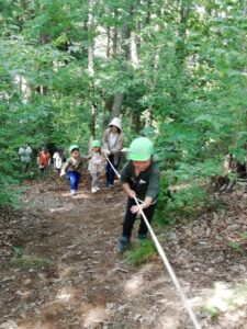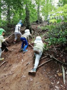 また、村所有の林を子どもたちがわくわくするような自然体験活動ができる林間のフィールドにしようと行政の職員とと園の保育士が知恵を出し合って工夫をしています。