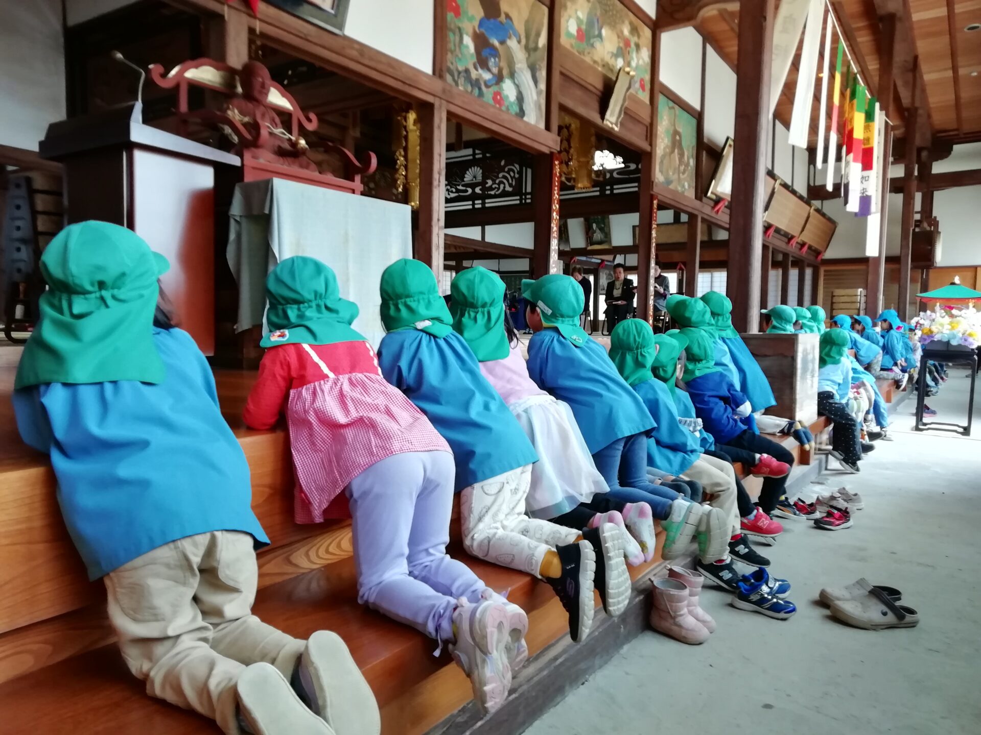 お釈迦様の誕生の話を聞き、「それを再現するのがお花まつり」と理解した子どもたち。実際に甘茶をかける時には自然と「おめでとう」と声をかける姿が見られました。見慣れないお寺の雰囲気やお花のにおいに五感を刺激される経験を通して発見や驚きを体験してきました。行事の意味を感じ取り、自分なりの言葉で表現する子どもの感性に、大きな成長を感じられる瞬間でした。
