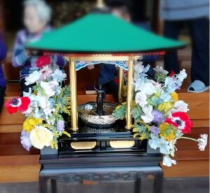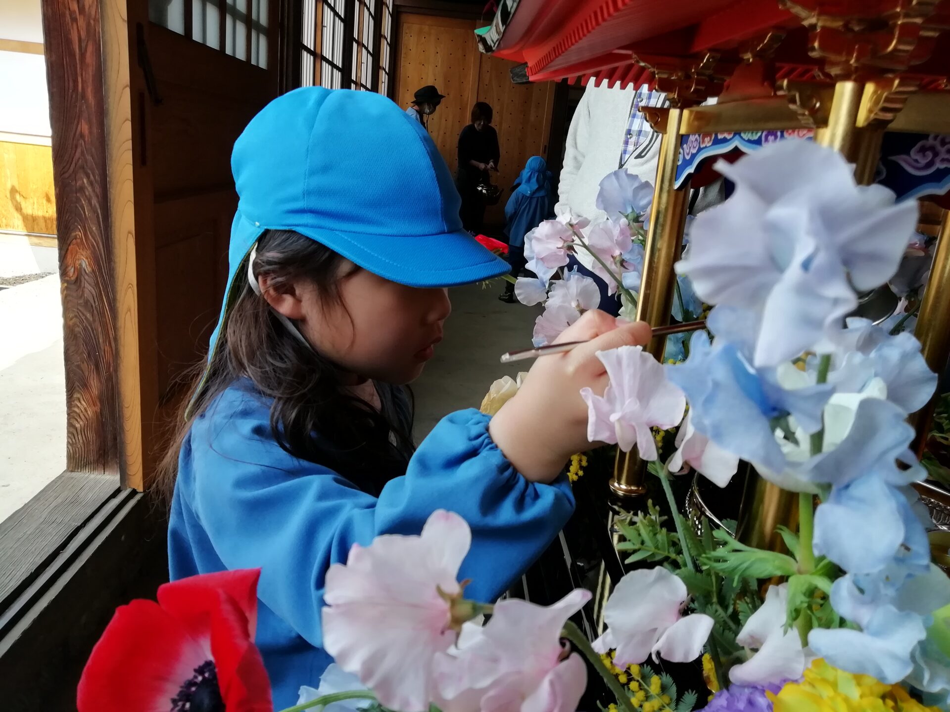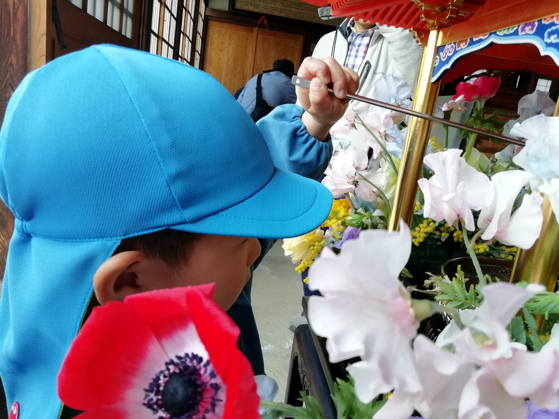 お寺に着き、「こんにちは」と子どもたちの元気な挨拶に、地域の方々はやわらかい笑顔で「こんにちは」と返してくれました。寺院の方からお花まつりの由来や意味を説明していただくと、子どもたちは真剣な表情で耳を傾けていました。境内には、色とりどりの花で飾られた花御堂があり、「きれい!」「お花のにおいがする!」と目を輝かせていました。お釈迦様に甘茶をかけると、「おめでとう」という言葉も聞こえてきました。
