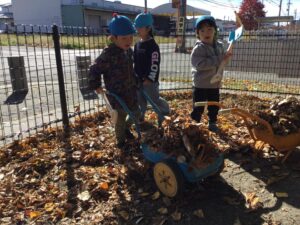 保育士も一緒に落ち葉を集めて、せっせと運んでいると・・・