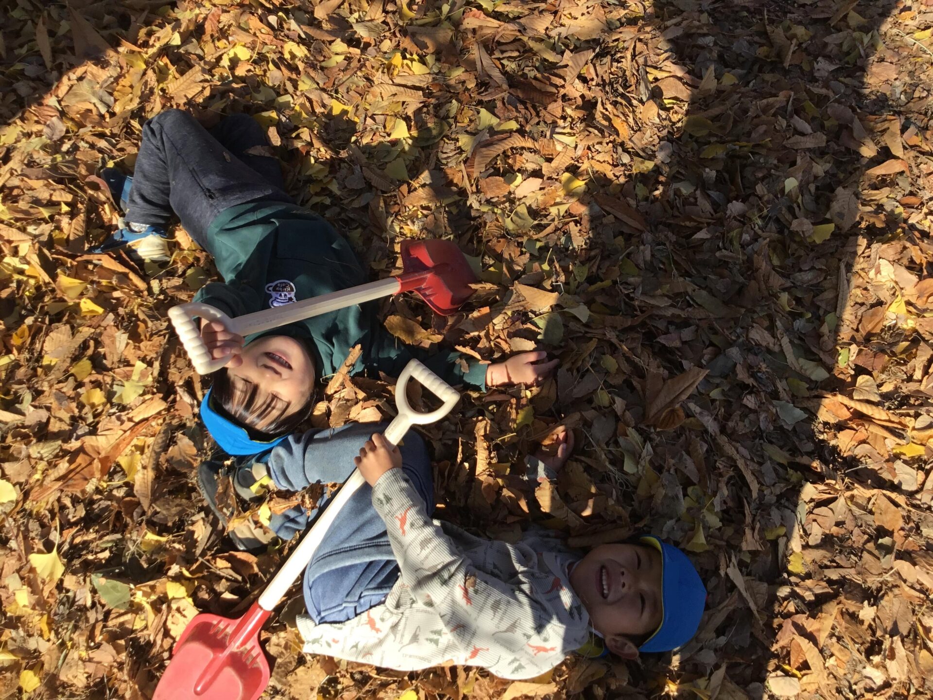 落ち葉を見て「ベッドを作りたい」と始まったこの遊びでしたが、どんどん遊びが変化していきました。大人の発想だとどうしても凝り固まってしまい、「あれ??!ベッドは・・・」と思わず言葉にしてしまいそうでしたが、とっても楽しそうな子どもたちの姿を見て、一緒に楽しくなった担任でした。