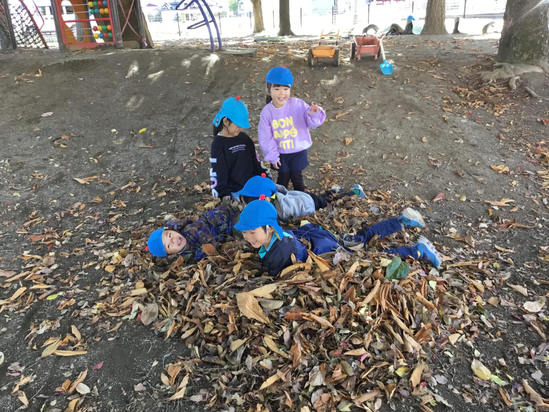 ただそこにあるように見える落ち葉でも、子どもたちにとっては最高な自然の玩具!!自分の思いや考えを言葉で友だちに伝え合いながら、同じものをイメージして作り上げようとする姿にここまでの成長を感じ、担任をさせてもらっている私としては嬉しく感じたこの遊びでした。自然豊かな環境の中で、のびのび子どもたちらしくたくさんこれからも遊んでほしいと思います。また、自分たちで発信する力も身についてきているので、保育者がどこまで援助するか、見守っていくか日々見極めて保育をしていきたいなと思います。