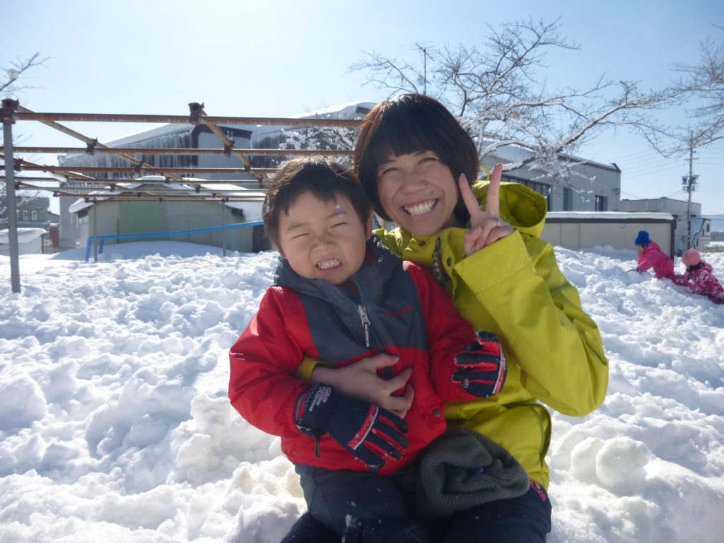 春は園庭の桜の木の下でお花見しながらおやつを食べ、散歩先では地域の方々と言葉を交わし、北信五岳を眺めながら芽吹きや紅葉、雪化粧する四季の移り変わりを肌で感じながら、真冬の1m以上積もる雪の中で元気に身体を動かし雪遊びも楽しんでいます。